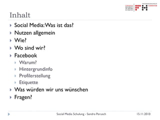 Das Dokument ist eine Schulung über die Grundlagen von Social Media mit Fokus auf Facebook, einschließlich Definitionen, Nutzen und Verwendung von sozialen Netzwerken. Es behandelt Themen wie Kommunikationsmittel, Profile, Etikette, sowie spezifische Strategien zur Profilgestaltung und Interaktion mit der Zielgruppe. Zudem werden weitere soziale Medien und deren Nutzungsmöglichkeiten für Mitarbeiter beschrieben.