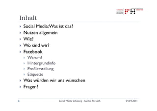 Die Schulung zu sozialen Medien von Sandra Perusch behandelt die Grundlagen von Social Media, deren Nutzen für Kommunikation und Markenbildung sowie die Nutzung von Plattformen wie Facebook. Schwerpunkte sind die Profilgestaltung, Etikette im Umgang mit sozialen Medien und die Integration in die Kommunikation der Zielgruppe. Zudem wird darauf hingewiesen, dass aktive Mitgestaltung in sozialen Netzwerken und die Veröffentlichung von Inhalten entscheidend für den Erfolg sind.