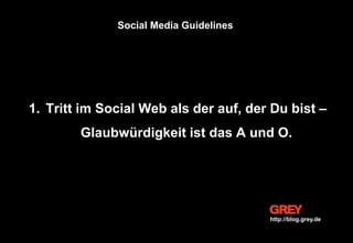 Das Dokument beschreibt die positive Einstellung einer Werbeagentur zu sozialen Medien und ermutigt Mitarbeiter, aktiv und respektvoll im Social Web zu agieren. Es gibt klare Guidelines, die Glaubwürdigkeit, Verantwortung und die Handschrift des Unternehmens betonen, während gleichzeitig auf den Umgang mit Herausforderungen und rechtlichen Aspekten hingewiesen wird. Ziel ist es, den Dialog mit Persönlichkeiten zu fördern und den Mehrwert sozialer Medien für die tägliche Arbeit zu nutzen.