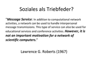 Das Dokument bietet einen Überblick über die Entwicklung sozialer Medien und ihrer Funktionen von den frühen Kommunikationsformen bis hin zu Plattformen wie Facebook, Myspace und Friendster. Es analysiert die soziale Dimension und Motivation hinter Netzwerken sowie den Einfluss dieser Plattformen auf die Kommunikation und die Unterhaltungskultur. Zudem wird auf alternative Netzwerke wie Diaspora eingegangen, die ein verteiltes, dezentralisiertes Modell verfolgen.