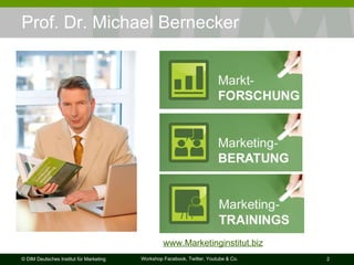 Das Webinar von Prof. Dr. Michael Bernecker behandelt die Bedeutung von Twitter im Online-Marketing und gibt Tipps für erfolgreiches Twittern, wie das Anlegen eines Unternehmensaccounts, die richtige Zielgruppenansprache und den Einsatz von Twitter-Tools. Es werden Statistiken und demografische Daten zu Twitter-Nutzern präsentiert sowie der Mehrwert von Twitter für Unternehmen darunter Kundenbindung und Marktforschung. Abschließend werden konkrete Handlungsempfehlungen gegeben, um die Interaktion und Follower-Zahl zu steigern.