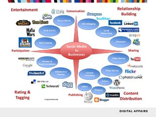 Das Dokument beschreibt einen Workshop über Social Media, insbesondere über Plattformen wie Facebook, Twitter und YouTube, sowie deren Nutzung für Unternehmen. Es werden relevante Statistiken und Funktionen von Social Media erklärt, grundlegende Strategien zur Nutzerinteraktion sowie die Vorteile für Unternehmen, um sich nachhaltig zu vernetzen und mit Zielgruppen zu kommunizieren. Verschiedene dimensionsbezogene Aspekte wie Identität, Konversation und Reputation werden als zentrale Themen behandelt.
