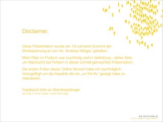 Andreas Klinger präsentierte am 18. Juli beim Summit der werbeplanung.at Konzepte zur Entwicklung von sozialen Netzwerken, wobei er die Verschiebung vom Web 2.0 zum Social Web thematisierte, das insbesondere die Vernetzung von Personen über zentrale Identitätsanbieter wie Facebook und Google beschreibt. Er betont, dass das Internet keine Versionsnummern hat und sowohl Web 2.0 als auch das Social Web wichtige, aber unterschiedliche Ansätze für digitale Interaktionen darstellen. Klinger erklärt, dass soziale Netzwerke eine vernetzte Darstellung des sozialen Graphen sind, der unsere Beziehungen und Identität wesentlich definiert.