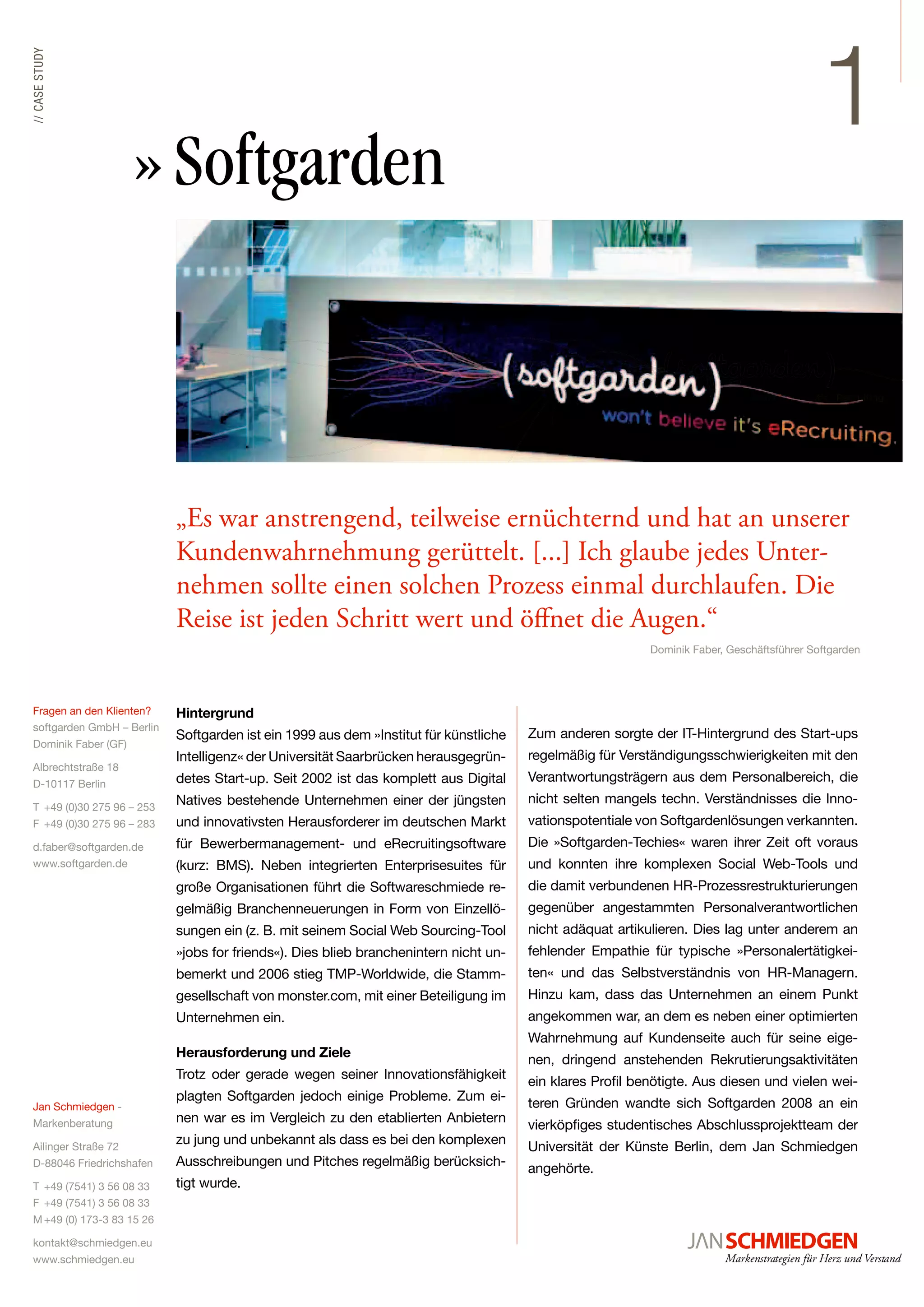Die Softgarden GmbH hat einen tiefgreifenden Veränderungsprozess durchlaufen, um ihr Profil als innovative HR-Software-Anbieter zu schärfen und sich am Markt klarer zu positionieren. In Zusammenarbeit mit einer Markenberatung wurde eine umfassende Analyse der Kundenwahrnehmung und eine Neupositionierung vorgenommen, um die Stärken und Schwächen des Unternehmens zu identifizieren und adressieren. Der Fokus lag auf der Optimierung des Kundenerlebnisses und dem Abbau von Berührungsängsten bei Personalverantwortlichen gegenüber Social Web Recruiting.