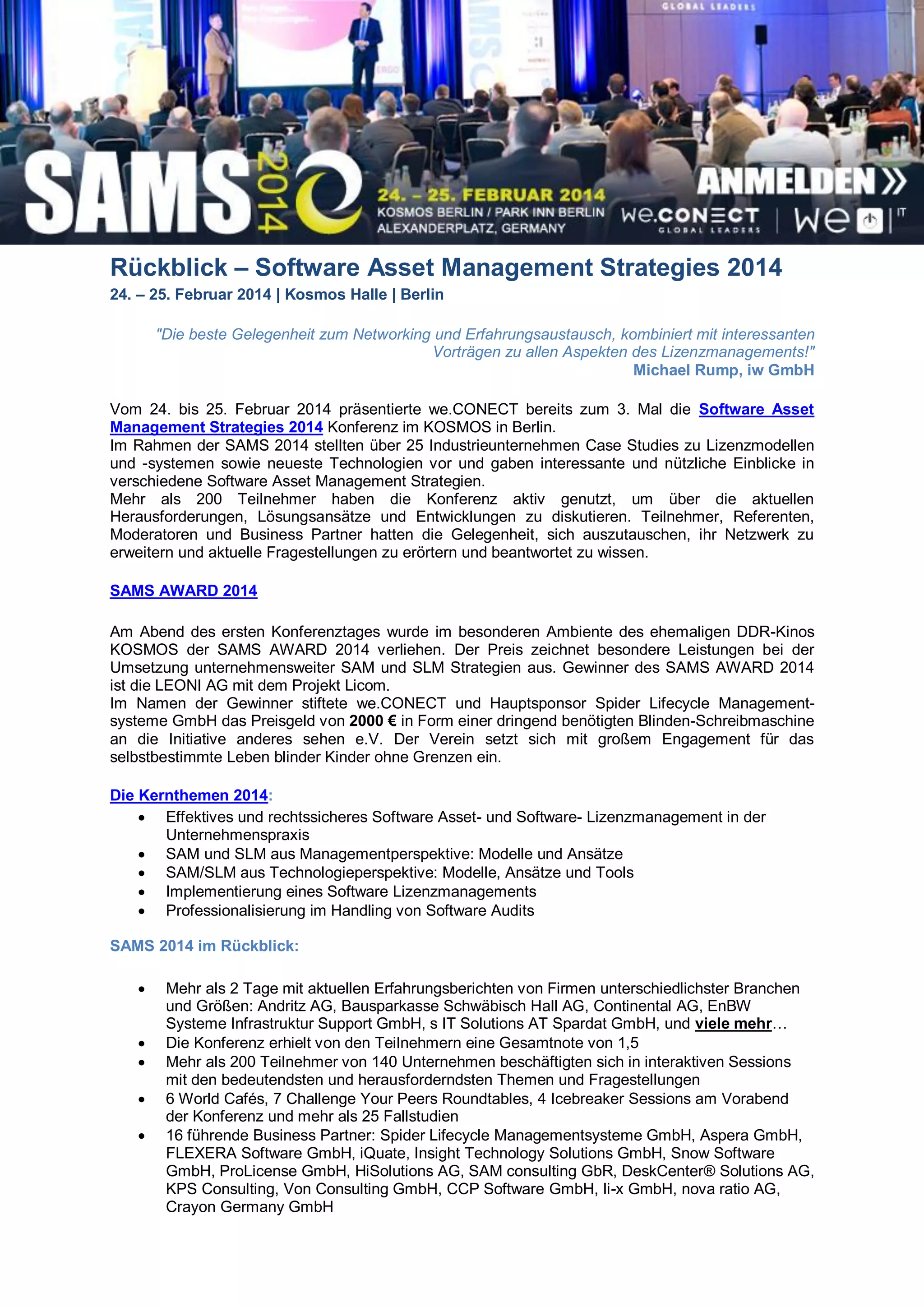 Die Software Asset Management Strategies 2014 Konferenz fand am 24. und 25. Februar in Berlin statt und bot über 200 Teilnehmern Einblicke in Lizenzmanagement und Software Asset Management durch Vorträge und Erfahrungen von über 25 Unternehmen. Die Veranstaltung beinhaltete interaktive Sessions, Fallstudien und wurde mit dem SAMS Award 2014, der an die Leoni AG verliehen wurde, abgerundet. Teilnehmer und Referenten konnten sich aktiv austauschen und wichtige Themen des Softwarelizenzmanagements diskutieren.