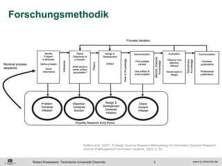 Das Dokument behandelt die Herausforderungen und Methoden in der Entwicklung von modellgetriebenen Business Intelligence (BI)-Systemen, darunter die Notwendigkeit, Durchlaufzeiten bei der Umsetzung neuer Anforderungen zu verkürzen und dabei Qualität und Kosten im Blick zu behalten. Es werden Forschungsziele und -fragen vorgestellt, die auf die Effizienzsteigerung und Anpassungen von BI-Systemen abzielen, sowie die Implementierung eines Test-Frameworks zur Unterstützung agiler Prozesse. Die Untersuchung zielt darauf ab, bestehende BI-Vorgehensmodelle zu analysieren und an agile Anforderungen anzupassen.
