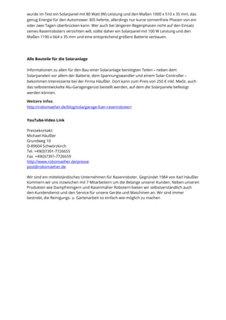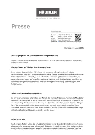 Die Firma Häußler hat ein Aluminium-Garagengerüst für Solaranlagen entwickelt, das es Rasenrobotern ermöglicht, unabhängig vom Stromnetz zu arbeiten. Mit einem 80 Watt Solarpanel konnte der Automower getestet werden, wobei für längere Phasen ohne Sonne ein leistungsstärkeres Panel empfohlen wird. Interessierte können das Gerüst sowie die benötigten Teile für die Solaranlage für 250 € bei Häußler erwerben.