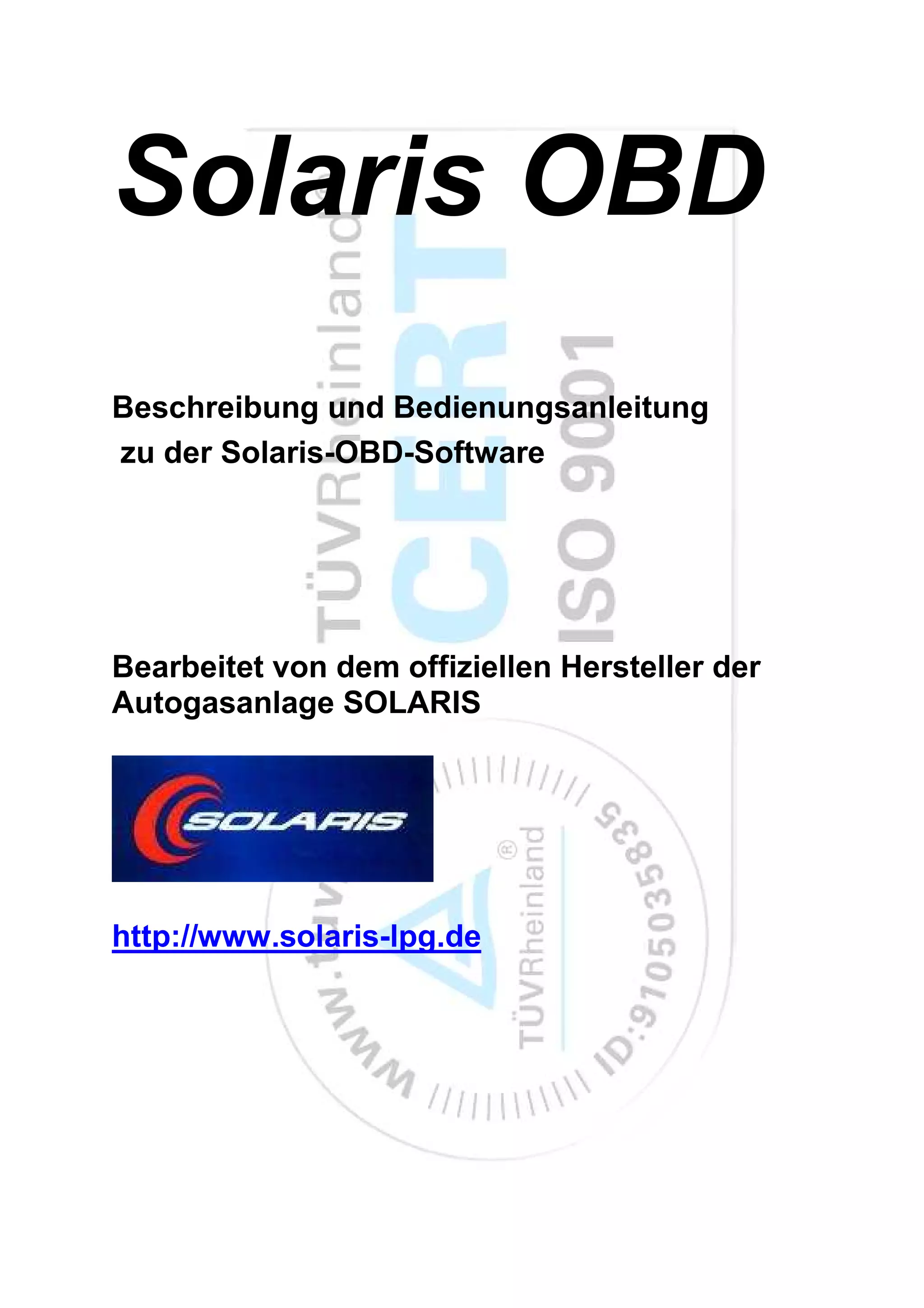 Das Dokument ist eine umfassende Beschreibung und Bedienungsanleitung für die Solaris-OBD-Software, die von dem Hersteller der Solaris-Autogasanlage bereitgestellt wird. Es enthält Informationen zu verschiedenen Funktionen wie Parameterwahl, Kennfeldanpassung, Selbstadoption, Diagnostik und OBD-Korrekturen sowie Anweisungen zur Konfiguration der Gasanlage und zur Fehlerdiagnose. Verschiedene technische Details zur Regulierung und Anpassung der Software sind ebenfalls enthalten.