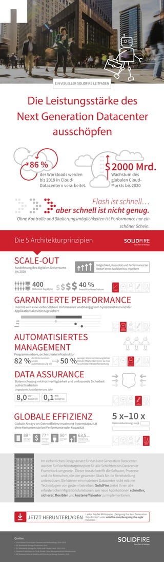 Das Dokument beschreibt die Entwicklung und Leistungsoptimierung von Next Generation Datacentern bis 2019, wobei der Fokus auf der effizienten Nutzung von Cloud-Technologien und Flash-Speicher liegt. Es wird betont, dass für ein modernes Datacenter ein neuer Ansatz nötig ist, der Automatisierung, globale Effizienz und garantierte Performance umfasst. Solidfire bietet Migrationstools an, um neue Anwendungen effizienter zu implementieren und die Systemkapazität zu maximieren.