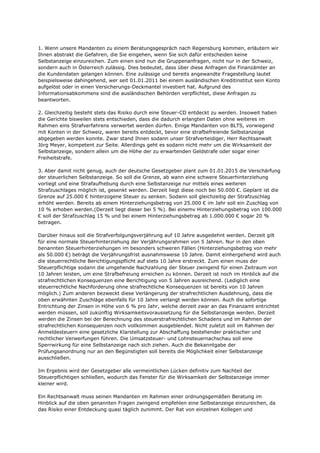 Das Dokument erörtert die rechtlichen Risiken und Herausforderungen im Zusammenhang mit der Einreichung einer strafbefreienden Selbstanzeige bei Steuerhinterziehung, insbesondere im Hinblick auf bevorstehende gesetzliche Verschärfungen ab 2015. Es wird betont, dass das Risiko der Entdeckung durch neue internationale Kooperationen und Datenabfragen steigt, und empfiehlt Mandanten dringend, sich proaktiv einer Selbstanzeige zu stellen, um rechtliche Konsequenzen zu minimieren. Die BLTS Rechtsanwälte in Regensburg bieten umfassende Beratung für betroffene Steuerpflichtige und warnen vor der Taktik, Probleme auszusitzen.