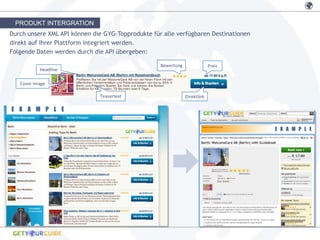 Die XML-API ermöglicht die Integration der GYG-Topprodukte für verschiedene Destinationen auf einer Plattform und überträgt Daten wie Bewertung, Preis und Teasertext. Eine Vielzahl an Bannern steht zur Verfügung, um Nutzer gezielt anzusprechen. Außerdem können XML-Feeds in Pre-Trip-E-Mails umgewandelt werden, um Buchende 5-15 Tage vor ihrer Reise anzusprechen.
