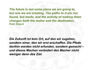 Die Zukunft ist eine von uns zu gestaltende Realität, und die Commons sind kollektive Ressourcen, die von Gemeinschaften geschaffen und genutzt werden. Das Dokument behandelt die Konzepte von Commons, deren Kontrolle und die Unterschiede zwischen Gemeineigentum und privatem Eigentum, während es auch vor den Herausforderungen der Übernutzung warnt. Es wird betont, dass Commons durch Kooperation, Selbstorganisation und ein gemeinsames Verständnis von Ressourcen gedeihen.