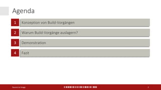 Das Dokument beschreibt den Source-to-Image-Prozess zur Erstellung fertiger Container-Images unter Verwendung von Docker, einschließlich der Konzeption von Build-Vorgängen und der Vorteile einer Auslagerung dieser. Es werden verschiedene Phasen demonstriert, in denen die Build-Umgebung optimiert wird, um Sicherheit und Geschwindigkeit zu steigern sowie die Größe der Images zu reduzieren. Abschließend wird die Möglichkeit diskutiert, das Build-Management zu vereinfachen und die Wartbarkeit zu erhöhen.