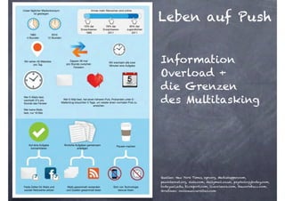 Das Dokument thematisiert den sozialen Druck und den Einfluss von Medienkonsum auf das tägliche Leben der Menschen, besonders in Bezug auf Online-Plattformen und Multitasking. Es wird auf die steigende Nutzung von sozialen Netzwerken und deren Auswirkungen auf zwischenmenschliche Beziehungen eingegangen. Zudem wird die Notwendigkeit von Transparenz und Vertrauen in digitalen Interaktionen hervorgehoben.