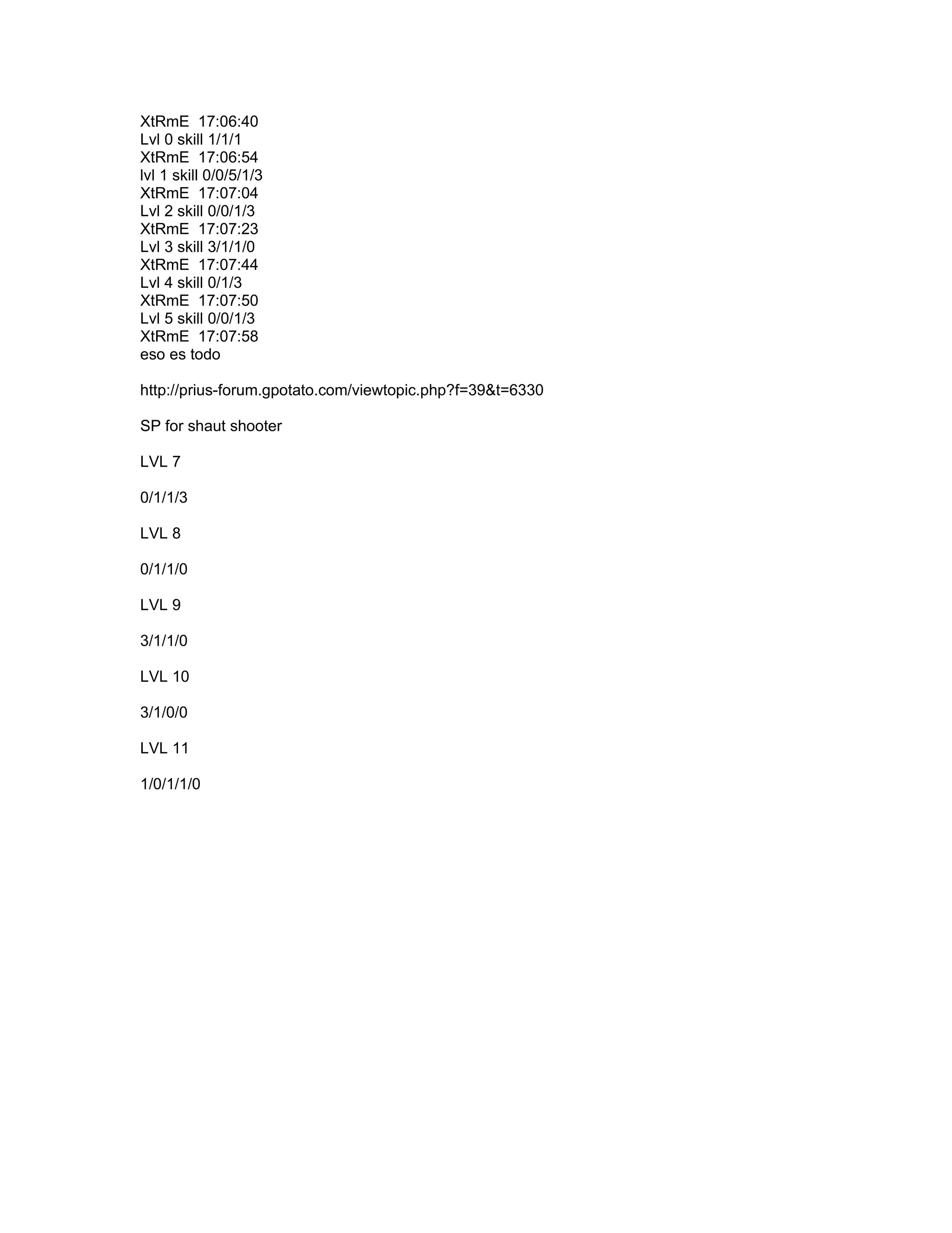 Das Dokument enthält eine Auflistung von Spielerleveln und Fähigkeiten eines Charakters namens xtrme in einem Spiel sowie einige Informationen über das Talent eines Scharfschützen. Die Level- und Skill-Daten sind in zeitlicher Abfolge angeordnet, wobei verschiedene Fähigkeitspunkte aufgeführt sind. Links zu einer externen Webseite sind ebenfalls enthalten.