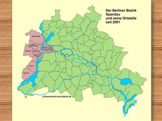 Spandau wurde 1920 aus dem ehemaligen Stadtkreis Spandau und anderen Gemeinden gebildet und liegt größtenteils am westlichen Ufer der Havel. Die Altstadt Spandau, die seit 1232 bekannt ist, beherbergt viele historische Bauwerke und das Rathaus Spandau, welches heute das Bezirksamt beherbergt. Der Bahnhof Berlin-Spandau ist der längste Hallenbahnhof Deutschlands und das ehemalige Kriegsverbrechergefängnis Spandau war von 1946 bis 1987 in Betrieb.