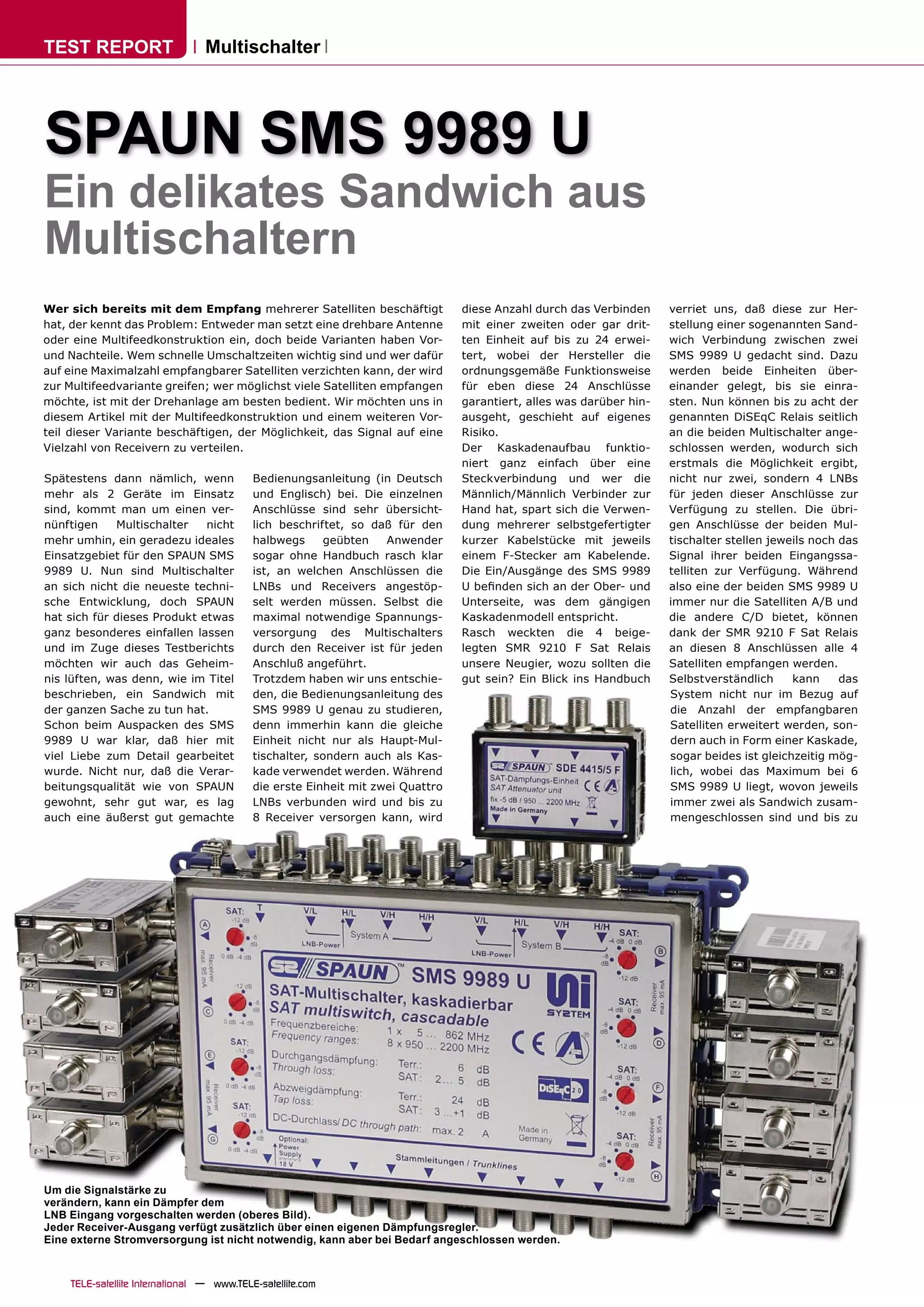 Der Testbericht beschreibt den multischalter Spaun SMS 9989 U, der bis zu 24 Satelliten angeschlossen und für schnelle Umschaltzeiten geeignet ist. Die Geräte ermöglichen eine Verbindung in Kaskade und bieten Dämpfungsregler für jeden Ausgang, um Signalverluste zu minimieren. Insgesamt wird das Produkt als hochwertig mit modernem Design und ausgezeichneter Funktionalität bewertet.