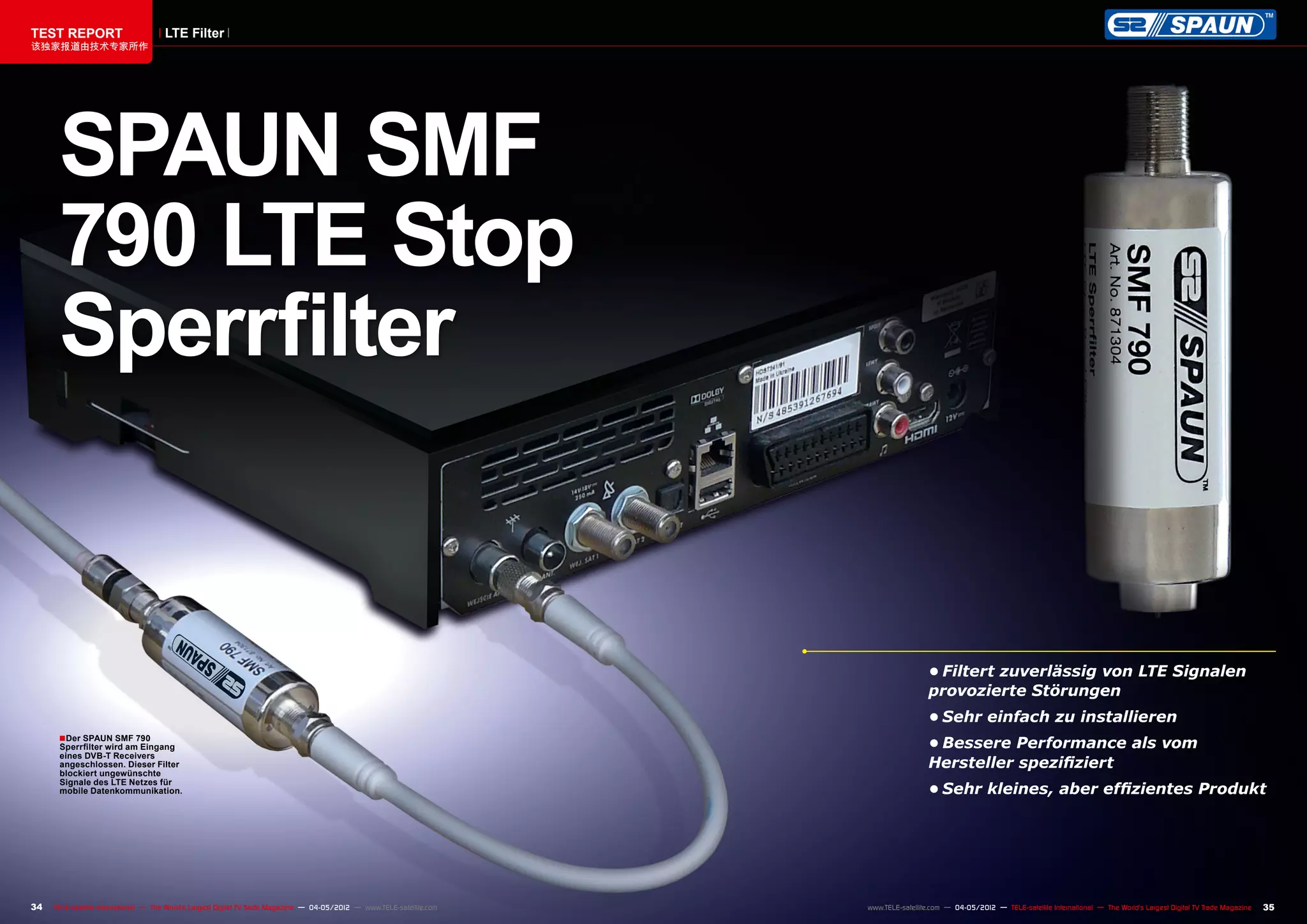 Der Spaun SMF 790 LTE Stopfilter verhindert effektiv Störungen von LTE-Signalen, die den Empfang von DVB-T/T2 beeinträchtigen können, und ist einfach zu installieren. Der Filter zeigt eine hohe Dämpfung für Frequenzen über 815 MHz und ermöglicht dadurch eine verbesserte Signalqualität bei der Verwendung von HDTV-Empfängern. Testberichte bestätigen die Zuverlässigkeit und Effizienz des Produkts im Vergleich zu anderen Empfangsanlagen.