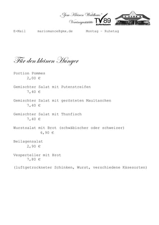 Die Vereinsgaststätte "Zum kleinen Waldhaus" in Zuffenhausen bietet ein vielfältiges Speise- und Getränkeangebot, einschließlich Hamburger, Hauptgerichten und einer Auswahl an alkoholischen und alkoholfreien Getränken. Die Öffnungszeiten sind von Dienstag bis Freitag 14:30-23:00 Uhr und am Wochenende von 09:30-23:00 Uhr, montags ist Ruhetag. Kontaktinformationen und Preisdetails sind ebenfalls im Dokument aufgeführt.