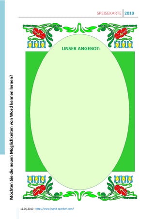 Das Dokument präsentiert die Speisekarte 2010 und bietet Informationen über neue Möglichkeiten von Word. Es könnte sich um eine Einladung oder Ankündigung zu einem Event handeln. Der Veröffentlichungstermin ist der 12. Mai 2010.