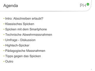 Das Dokument behandelt moderne Spickmethoden in Schulen, die durch technologische Geräte wie Smartphones und Smartwatches ermöglicht werden. Es werden verschiedene Formen des Schummelns sowie pädagogische Maßnahmen zur Bekämpfung von Spicken vorgestellt, einschließlich der Anpassung von Prüfungsfragen. Abschließend wird diskutiert, ob Spicken als strategische Lernmethode oder als unethisches Verhalten betrachtet werden sollte.