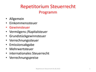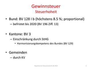 Das Dokument behandelt umfassend das Schweizer Steuerrecht, insbesondere die Gewinnsteuer, einschließlich der Steuerhoheit, Steuerobjekte, und spezifische Regelungen für juristische Personen sowie Umstrukturierungen. Es beleuchtet weiterhin besondere steuerliche Status wie Holdinggesellschaften und deren Steuerbefreiungen, während es auch die Unterschiede zwischen Kantonen und Gemeinden hervorhebt. Abschließend werden wichtige Aspekte wie Steuervergünstigungen, Beteiligungsabzüge und die steuerlichen Konsequenzen für Kapitalgesellschaften erläutert.