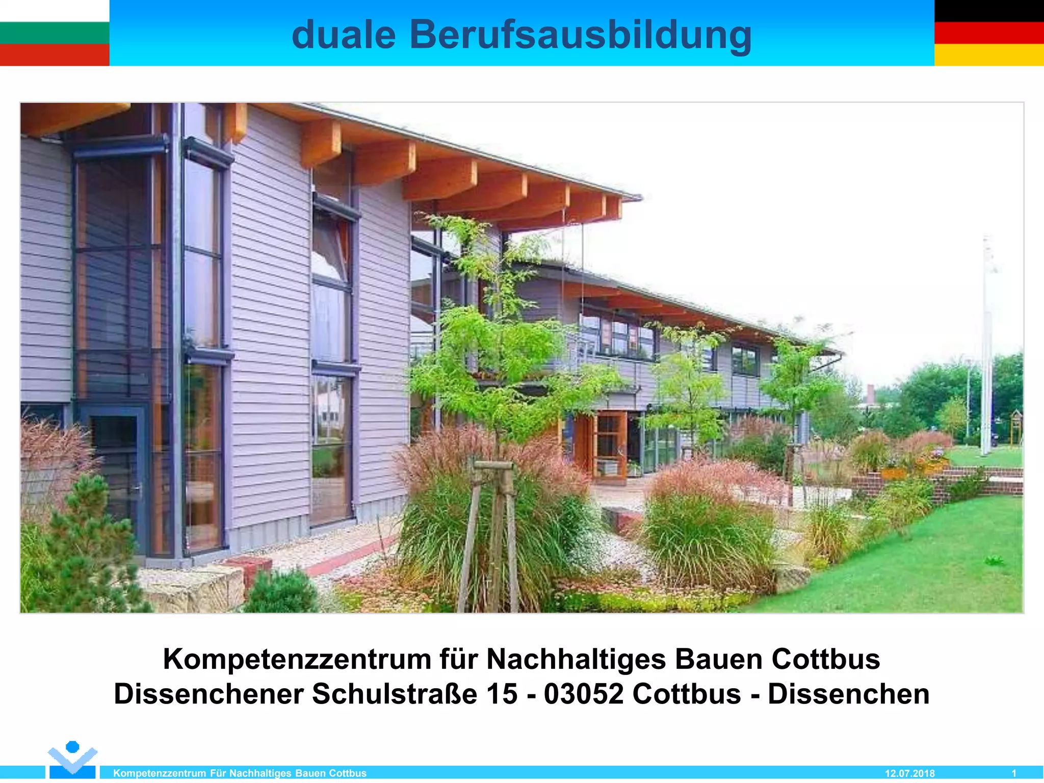 Das Dokument beschreibt die duale Berufsausbildung im Bereich des nachhaltigen Bauens am Kompetenzzentrum Cottbus, einschließlich der Ausbildungsstruktur, -inhalte und -finanzierung. Es detailliert verschiedene Berufe im Hoch-, Tief- und Ausbau sowie den Verlauf der theoretischen und praktischen Ausbildung über mehrere Jahre hinweg. Zudem werden die relevanten Rahmenbedingungen, Prüfungen und die Rolle der Berufsschulen und überbetrieblichen Ausbildungszentren erläutert.