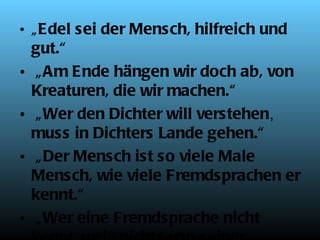 Das Dokument enthält Zitate von Johann Wolfgang von Goethe, die seine Ansichten über den Menschen, die Sprache und die Kreativität reflektieren. Es thematisiert die Bedeutung der Hilfsbereitschaft, die Abhängigkeit von Kreationen und die Notwendigkeit, sich mit der Dichtung auseinanderzusetzen. Zudem wird angedeutet, dass die Vielsprachigkeit des Menschen dessen Wesen bereichert.