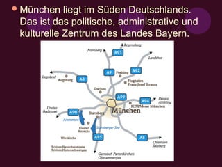 München ist die Hauptstadt von Bayern und das politische sowie kulturelle Zentrum der Region. Die moderne Stadt, die über 800 Jahre alt ist, hat etwa 1,3 Millionen Einwohner und bietet zahlreiche Sehenswürdigkeiten wie den Olympiapark, den Englischen Garten sowie verschiedene Museen und Denkmäler.