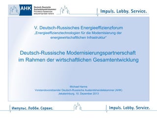 Das Dokument beschreibt die deutsch-russische Zusammenarbeit im Bereich der Energieeffizienz und Modernisierung der Infrastruktur, einschließlich Wirtschaftsdaten und der Präsenz deutscher Unternehmen in Russland. Es werden Geschäftschancen und aktuelle Entwicklungen in der Industriepolitik sowie die Bedeutung von Partnerschaften für die Modernisierung bis 2030 hervorgehoben. Zudem werden die Rolle der Deutsch-Russischen Auslandshandelskammer und deren Dienstleistungen für Unternehmen erwähnt.