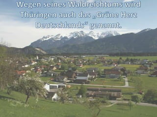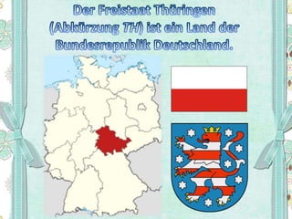 Thüringen ist ein Bundesland der Bundesrepublik Deutschland, das aus 16 Bundesländern besteht, mit einem Parlament (Bundestag) und einer Hauptstadt. Es grenzt an fünf andere Bundesländer und beheimatet zahlreiche historische Stätten und Persönlichkeiten wie Goethe und Luther. Die Region bietet eine reiche kulturelle Landschaft mit Burgen, Schlössern und der Möglichkeit, die entspannte Atmosphäre zu genießen.