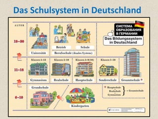 Das Dokument vergleicht die Schulsysteme in Deutschland und Russland und beschreibt die verschiedenen Bildungsetappen in beiden Ländern. In Deutschland besteht das System aus Primarstufe, Sekundarstufe I und II mit verschiedenen Schularten wie Hauptschule, Realschule, Gesamtschule und Gymnasium, während in Russland die Schüler nach der Grundschule Hauptschule oder Fachschule besuchen. Es wird festgestellt, dass die deutsche Bildungsstruktur vielseitiger ist und mehr berufliche Chancen durch duale Ausbildungssysteme bietet.