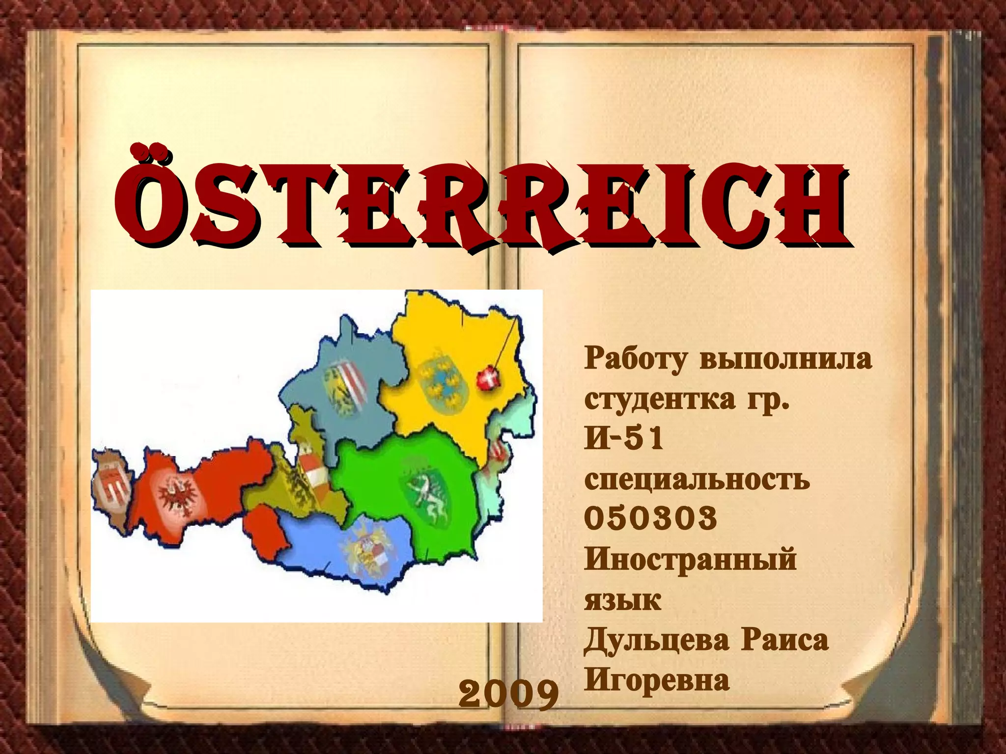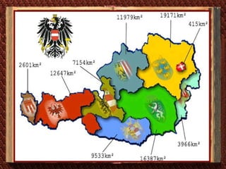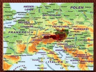 Das Dokument beschreibt Österreich, einschließlich seiner geographischen Merkmale, politischen Struktur und Wirtschaft. Es erwähnt das politische System mit dem Bundespräsidenten und dem Nationalrat sowie die wichtigsten wirtschaftlichen Branchen. Die Staatsflagge ist rot-weiß-rot, und die Bevölkerungszahl beträgt etwa 7,5 Millionen Menschen.