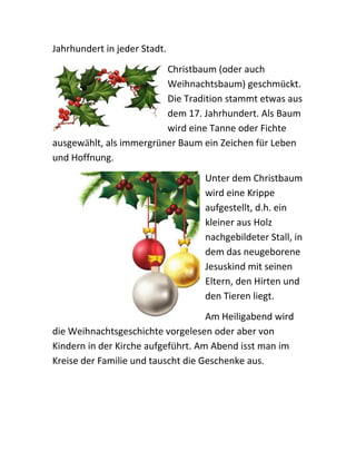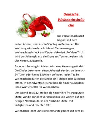 Die Vorweihnachtszeit in Deutschland beginnt mit dem ersten Advent, bei dem Wohnungen weihnachtlich dekoriert werden. Traditionell erhalten Kinder einen Adventskalender und bereiten Wunschzettel vor, während am Nikolaustag Süßigkeiten in Stiefel gesteckt werden. Am Heiligabend versammeln sich die Familien zum Feiern und Geschenke austauschen, nach dem Vorlesen der Weihnachtsgeschichte.