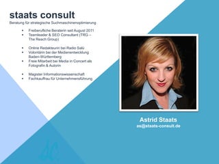 Das Dokument behandelt die Bedeutung von Suchmaschinenoptimierung (SEO) und Online-Pr für lokale Medien, geführt von Astrid Staats, einer erfahrenen Beraterin auf dem Gebiet. Es werden Methoden zur Generierung organischer Links, die Rolle von Keywords und das Linkbuilding thematisiert. Zudem wird darauf hingewiesen, dass eine gezielte Sichtbarkeit bei Google essenziell für den Erfolg von Medienunternehmen ist.
