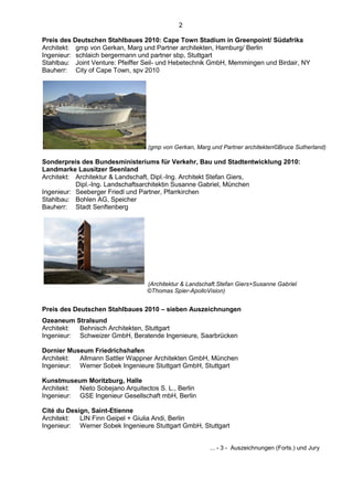 Das Cape Town Stadium in Südafrika wurde mit dem Preis des Deutschen Stahlbaues 2010 ausgezeichnet und gilt als herausragendes Beispiel deutscher Architektur. Der Sonderpreis des Bundesministeriums für Verkehr, Bau und Stadtentwicklung ging an das Projekt „Landmarke Lausitzer Seenland“, das den Wandel der Region durch die Schaffung einer attraktiven Seenlandschaft symbolisiert. Die Preisverleihung findet am 08. Oktober 2010 in Weimar statt, begleitet von weiteren Auszeichnungen für verschiedene Architekturprojekte.