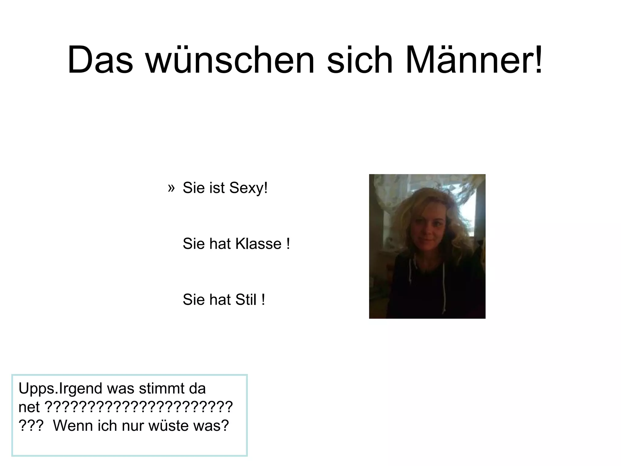 Das Dokument reflektiert die Wünsche von Männern bezüglich attraktiver Frauen, die als sexy, stilvoll und mit Klasse beschrieben werden. Es deutet auf eine Unsicherheit hin, die sich aus dem Streben nach diesen Eigenschaften ergibt. Letztendlich zeigt es, dass Männer klare Vorstellungen davon haben, was sie sich in einer Partnerin wünschen.