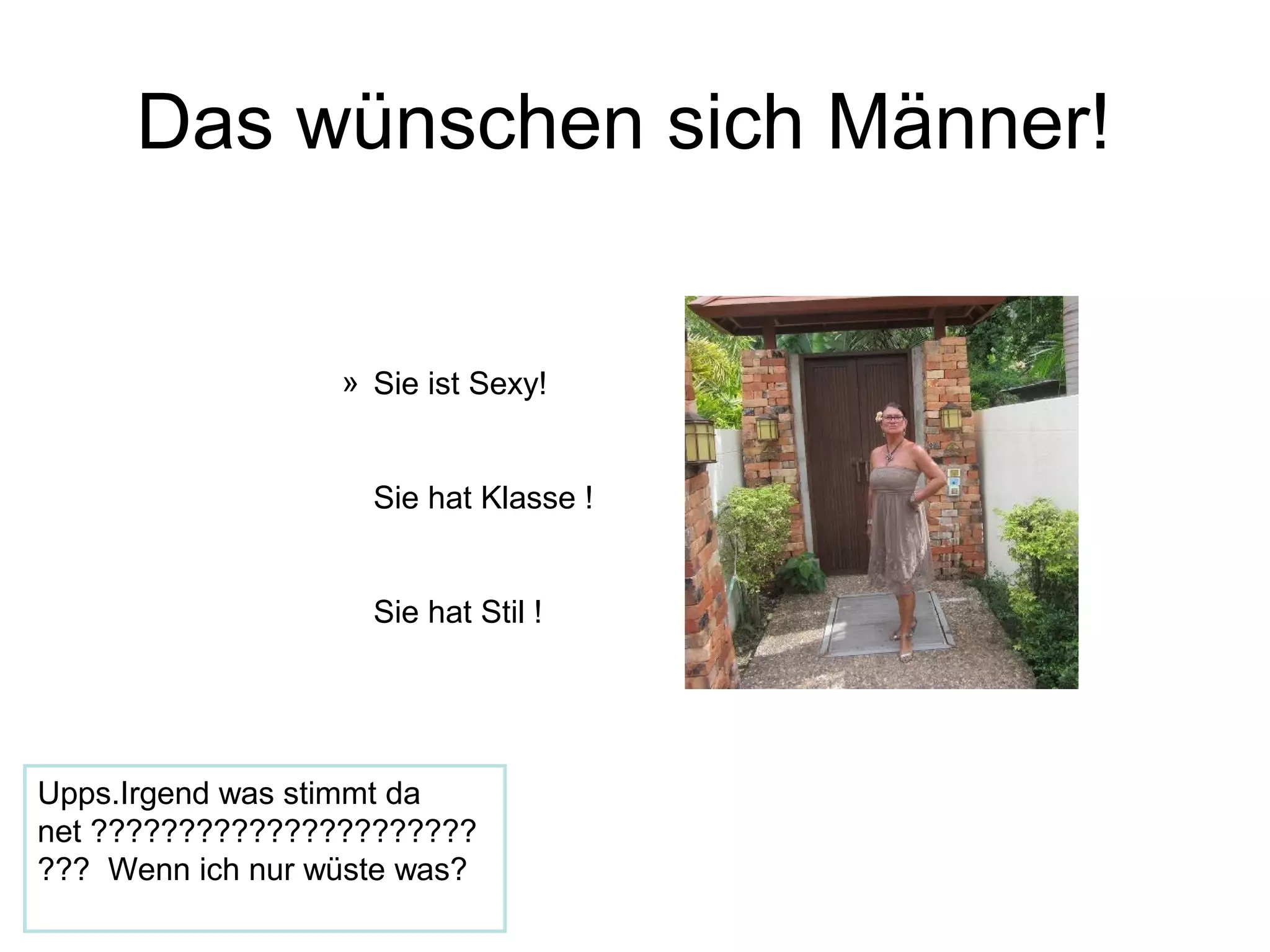 Das Dokument beschreibt die Eigenschaften, die Männer sich bei Frauen wünschen, wie Sexyness, Klasse und Stil. Es deutet darauf hin, dass es Unsicherheiten und Missverständnisse in Bezug auf diese Wünsche gibt. Der Text vermittelt eine Art Frustration und den Wunsch nach Klarheit über die Erwartungen.