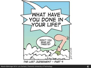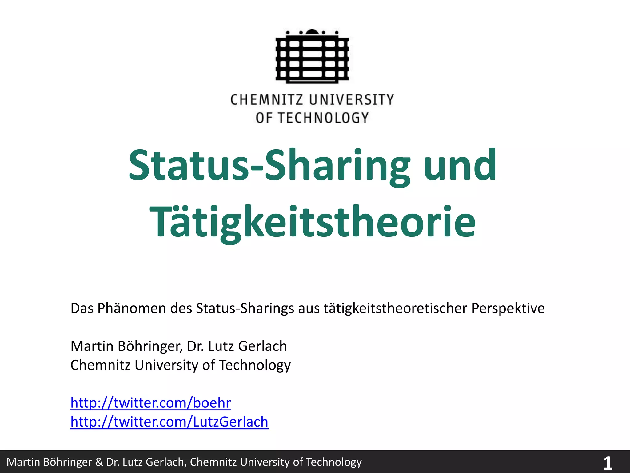 Das Dokument analysiert das Phänomen des Status-Sharings aus der Perspektive der Tätigkeitstheorie und hebt hervor, dass Status-Sharing eine bewusste Externalisierung von Handlungen darstellt. Es wird festgestellt, dass Status-Sharing ein Produkt der zunehmenden Vernetzung und Beschleunigung in der Wirtschaft ist und als Mittel für die Unternehmensanwendung dient. Schlussfolgernd sind verhaltenswissenschaftliche Analysemodelle hilfreich, um das Verständnis von Social Software zu fördern.