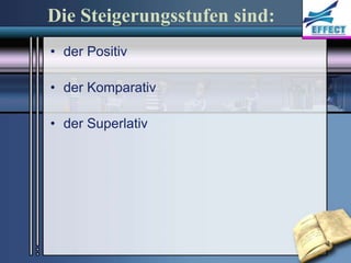 Das Dokument behandelt die Steigerungsformen von Adjektiven, die in Positiv, Komparativ und Superlativ unterteilt sind. Es erläutert, wie diese Formen gebildet werden und gibt Beispiele für unterschiedliche Adjektive sowie deren Steigerungsstufen. Außerdem wird der Gebrauch in verschiedenen Kontexten und besondere Adjektive mit Umlaut oder unregelmäßige Steigerungen angesprochen.