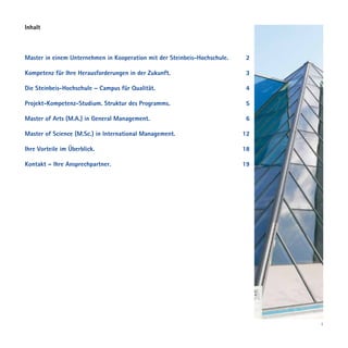 Das Dokument beschreibt ein zweijähriges, berufsbegleitendes Masterstudium in Kooperation mit der Steinbeis-Hochschule, das auf einen staatlich anerkannten und international akkreditierten Abschluss zielt. Die Programme 'Master of Arts in General Management' und 'Master of Science in International Management' bieten eine praxisorientierte Ausbildung mit einem hohen Anteil an Projektarbeit. Studierende arbeiten während des Studiums in Unternehmen und wenden erlernte Theorien direkt auf reale Projekte an, unterstützt durch moderne Lernmethoden wie blended learning.