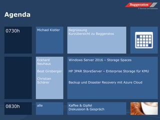 Das Frühstücksbriefing vom 3. November 2015 behandelte Storage-Trends für KMUs mit einem Fokus auf Microsoft Windows Server 2016 und HP 3PAR-Speicherlösungen. Themen umfassten Backup-Strategien, Disaster Recovery mit Azure-Cloud und neue Möglichkeiten für Storage-Management durch Software-Defined Storage (SDS). Die Veranstaltung bot auch Einblicke in Kostenbeispiele und die Implementierung von Datensicherung und Wiederherstellungsprozessen für Unternehmen.