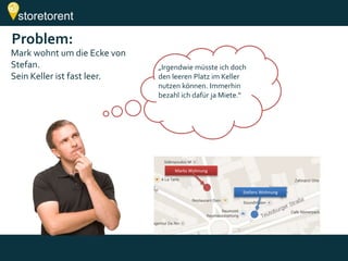 Storetorent ist eine Internetplattform, die es Nutzern ermöglicht, ungenutzten Raum wie Keller oder Garagen zur Verfügung zu stellen und diesen als Lagerplatz zu vermieten. Das Geschäftsmodell umfasst Provisionen, Versicherungen und Zusatzangebote wie Umzugsservices. In deutschen Großstädten gibt es erhebliches Potenzial mit schätzungsweise 500.000 m² lagerfähiger Fläche, was Storetorent einen Marktanteil von 10 % und ein Umsatzpotential von 100 Millionen Euro in der Self-Storage Branche bietet.
