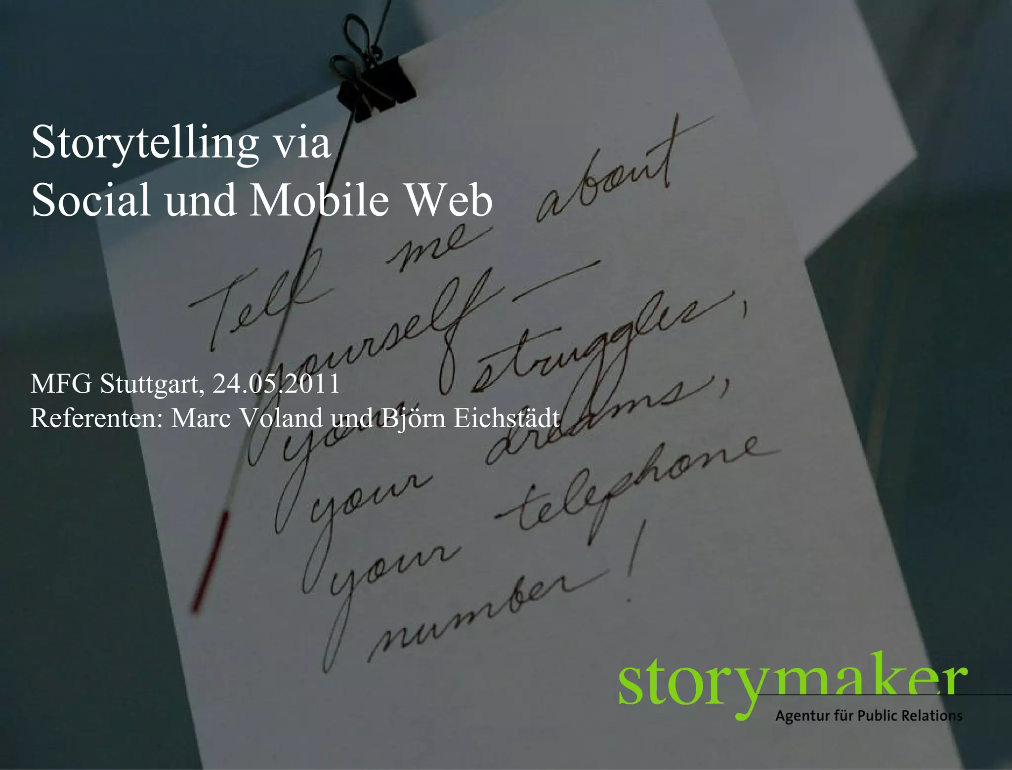 Das Dokument behandelt das Thema Storytelling im Social und Mobile Web und illustriert, wie Unternehmen durch fesselnde Geschichten erfolgreich kommunizieren können. Beispielhaft wird eine traditionsreiche Bäckerei hervorgehoben, die durch Qualität und Kundenbindung konkurriert. Zudem werden Schlüsselelemente für effektives Storytelling und die Bedeutung der Vernetzung in der heutigen digitalen Welt thematisiert.