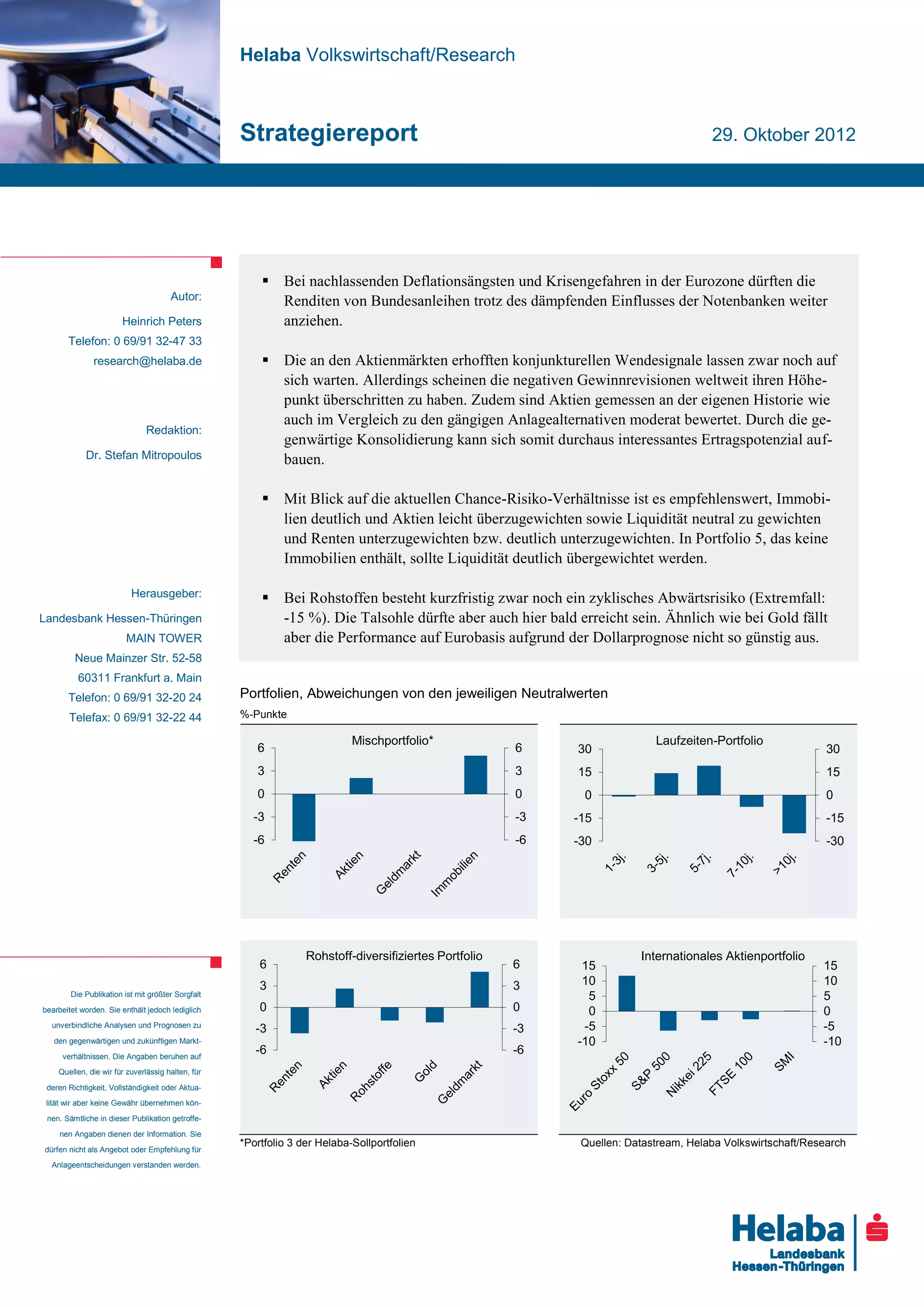 Der Strategiereport vom 29. Oktober 2012 zeigt, dass die Renditen deutscher Staatsanleihen trotz anhaltender Krisengefahren in der Eurozone zunehmen könnten, während Aktienmärkte ein moderates Ertragspotential aufweisen. Es wird empfohlen, Immobilien und Aktien zu übergewichten und Renten zu untergewichten, während Rohstoffe kurzfristig noch unter Druck stehen, jedoch eine mögliche Erholung in Aussicht gestellt wird. Der Ausblick auf die globale Wirtschaft bleibt gedämpft, mit Anzeichen einer Stabilisierung insbesondere in den USA und China.