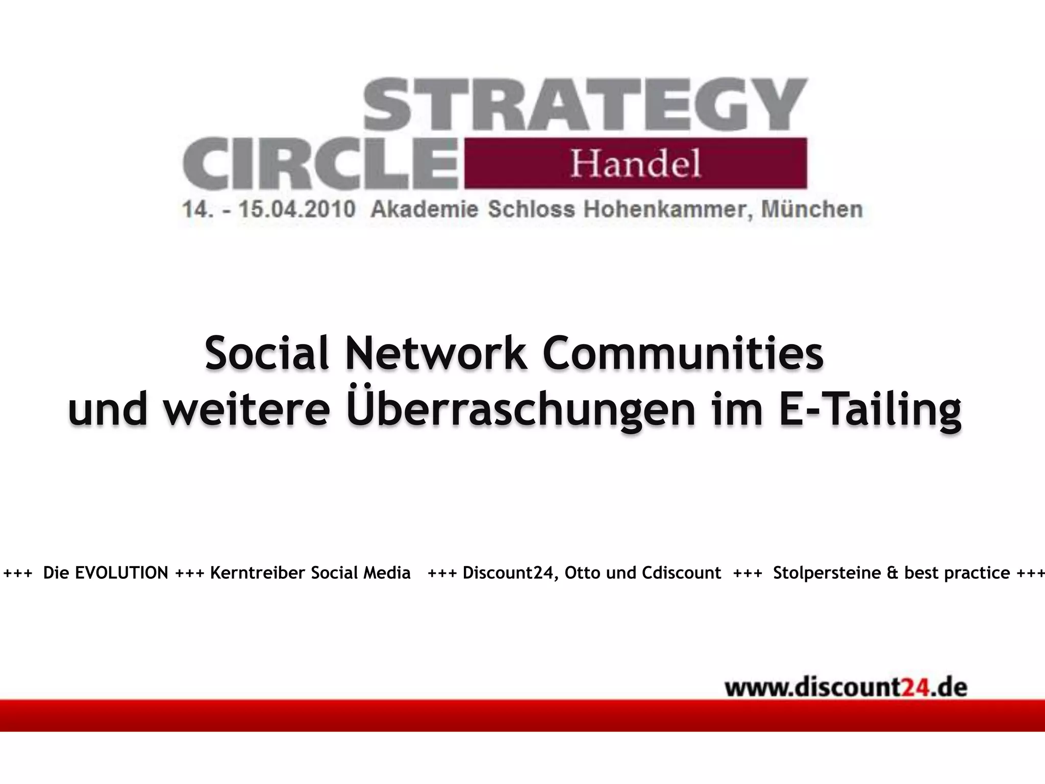 Das Dokument analysiert die Entwicklung und Bedeutung von Social Media im E-Commerce, insbesondere durch Social Commerce und die Veränderung des Konsumentenverhaltens hin zu mehr Online-Interaktion. Es werden Kerntreiber wie User-Generated Content und cloudbasierte Speicherung sowie Strategien von Unternehmen wie Discount24 und Cdiscount präsentiert, um Kunden online zu gewinnen und zu binden. Zudem wird auf die Veränderungen in der Mediennutzung und die Notwendigkeit einer strategischen Herangehensweise im Marketing hingewiesen.
