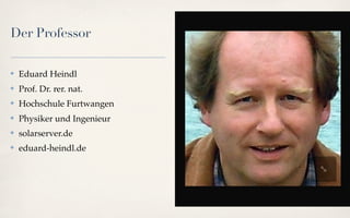 Die Präsentation von Professor Eduard Heindl behandelt die Nutzung von Lageenergie zur Stromspeicherung in einem 1.000 Meter breiten und 500 Meter hohen felszylindrischen Speicher. Es wird die Struktur des Stromverbrauchs und der Erzeugung im Jahr 2010 und 2011 analysiert, einschließlich des Bedarfs in verschiedenen Sektoren. Zudem wird das Konzept von Smart Homes und die zukünftige Energieversorgung skizziert, mit einem Fokus auf erneuerbare Energien und moderne Technologien.