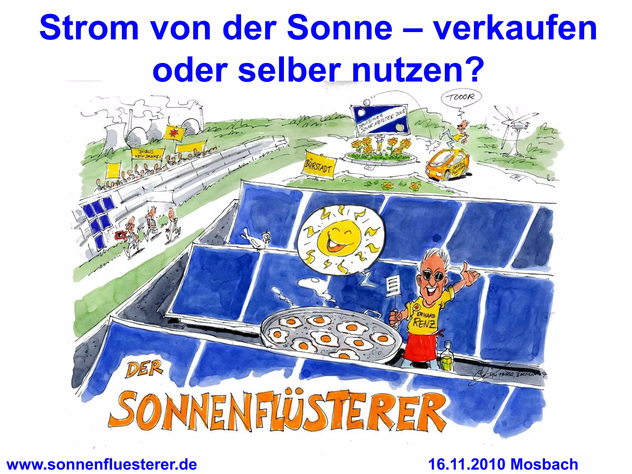 Das Dokument befasst sich mit der Nutzung und Einspeisung von Solarstrom, einschließlich der Kosten und Erträge von Photovoltaikanlagen sowie den aktuellen Einspeisevergütungen. Es werden verschiedene Technologien und deren Wirkungsgrade, die Strompreisentwicklung sowie zukünftige Trends im Bereich der Solarenergie analysiert. Zudem wird die Entscheidung zwischen der Eigenverwendung und dem Verkauf von Strom thematisiert, einschließlich der wirtschaftlichen Faktoren für private Haushalte.