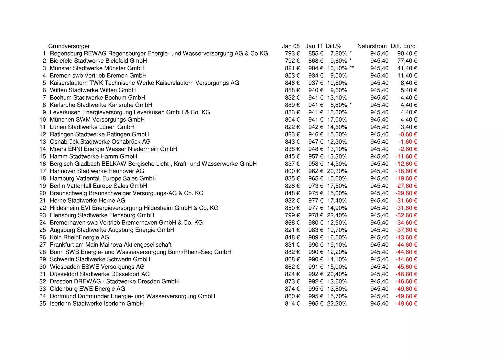 Das Dokument zeigt die Preisdifferenzen und prozentualen Änderungen der Erdgaspreise verschiedener Grundversorger in Deutschland von Januar 2008 bis Januar 2011. Insgesamt sind erhebliche Preissteigerungen zu verzeichnen, die in den meisten Fällen im zweistelligen Prozentbereich liegen. Einige Anbieter kündigen zudem zukünftige Preiserhöhungen an, während andere sogar Preisabsenkungen verzeichnen.