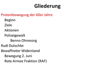 Die Protestbewegung der 60er Jahre begann 1961 in Deutschland als Reaktion auf den Ausschluss des SDS aus der SPD und beinhaltete zahlreiche Aktionen gegen autoritäre Strukturen, Krieg und soziale Ungerechtigkeit. Wichtige Ereignisse waren die Erschießung des Studenten Benno Ohnesorg und das Attentat auf Rudi Dutschke, die zu einer Radikalisierung und zur Entstehung bewaffneter Gruppen wie der Bewegung 2. Juni und der Roten Armee Fraktion (RAF) führten. Die Bewegung hatte auch internationale Ausstrahlung und war geprägt von Antikapitalismus, Antiimperialismus und einer Forderung nach sozialen Veränderungen.